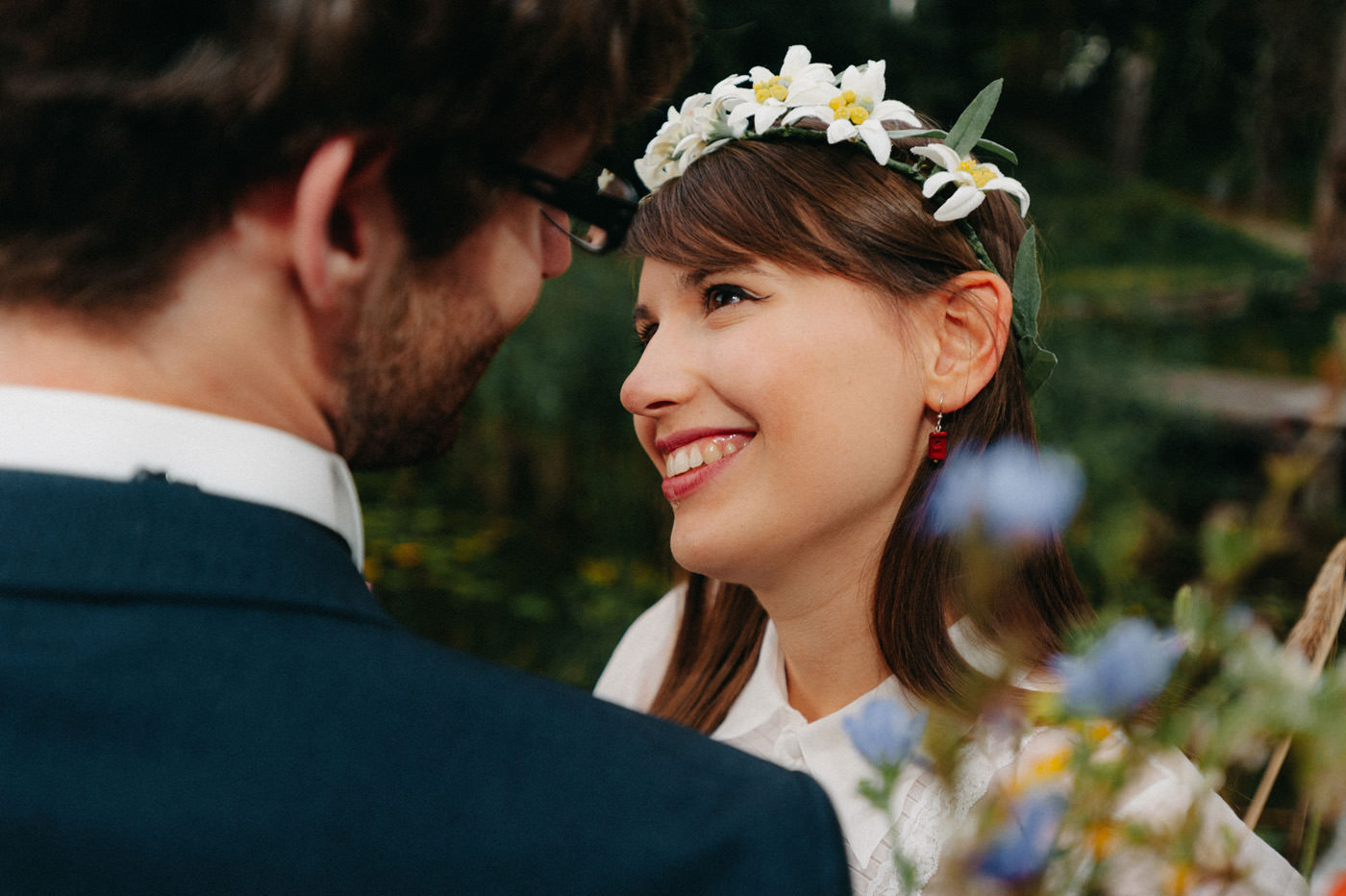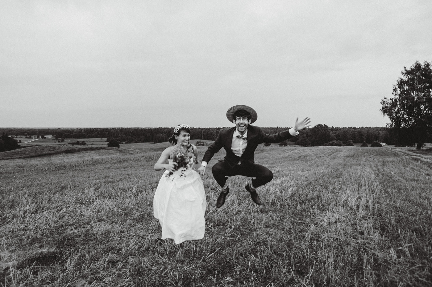 Detale ślubne: Panna młoda: Długa suknia ślubna: Pronuptia Paris, krótka – personal project. Opaska: Ptaszarnia. Buty: La Marka, Warszawa. Kolczyki: Aukso Avis, Wilno. Pan młody: Garnitur: Pawo. Krawat: Marthu. Koszula: Kastor. Spinki: Kruk. Pasek: Massimo Dutti. Buty: McArthur